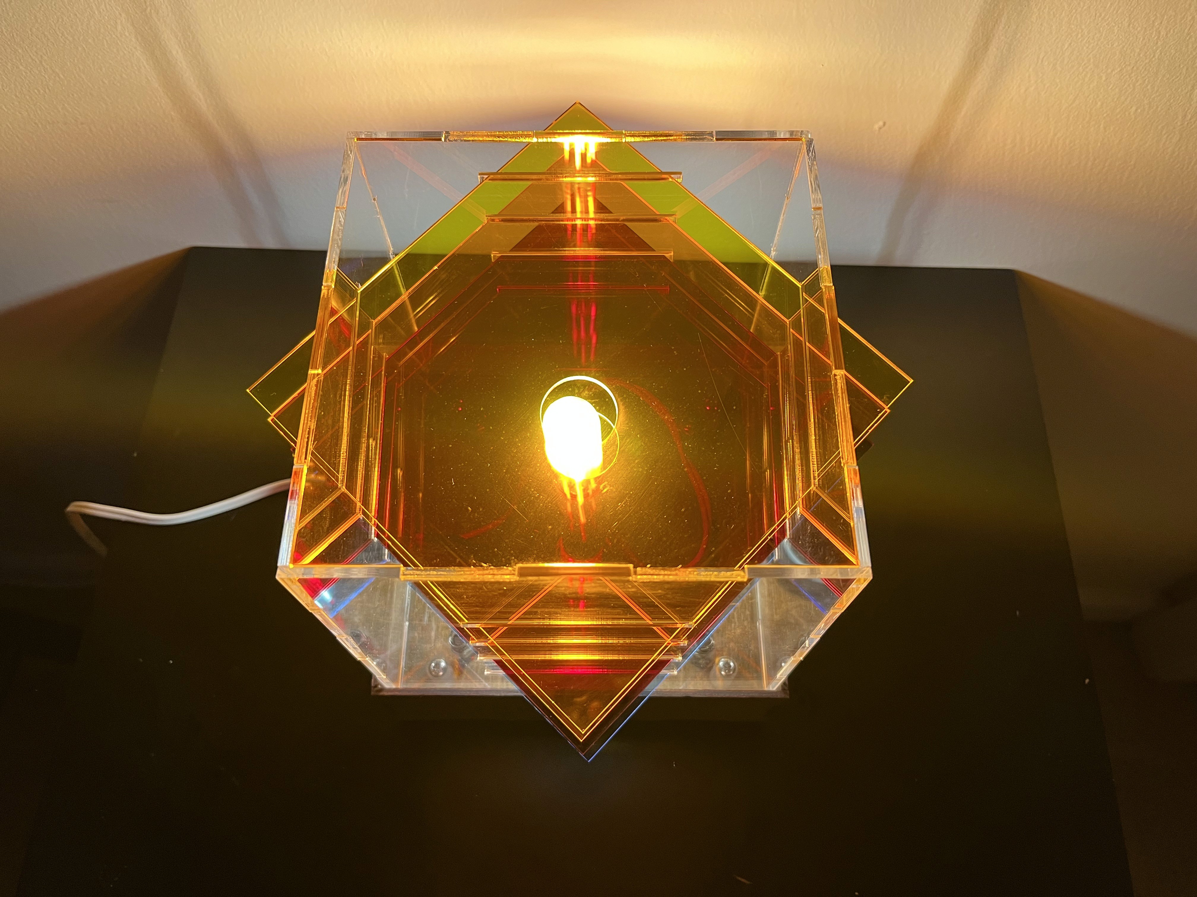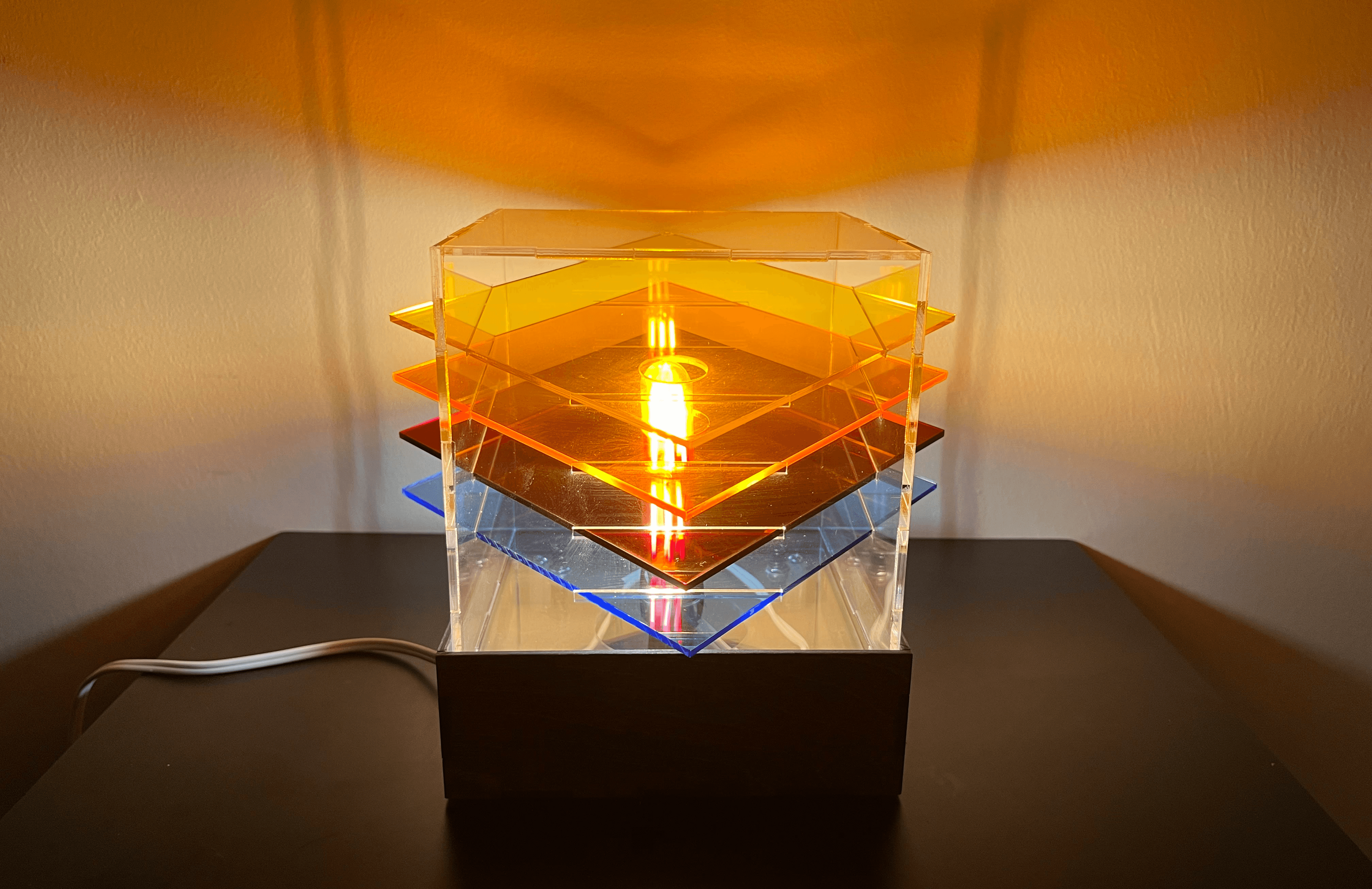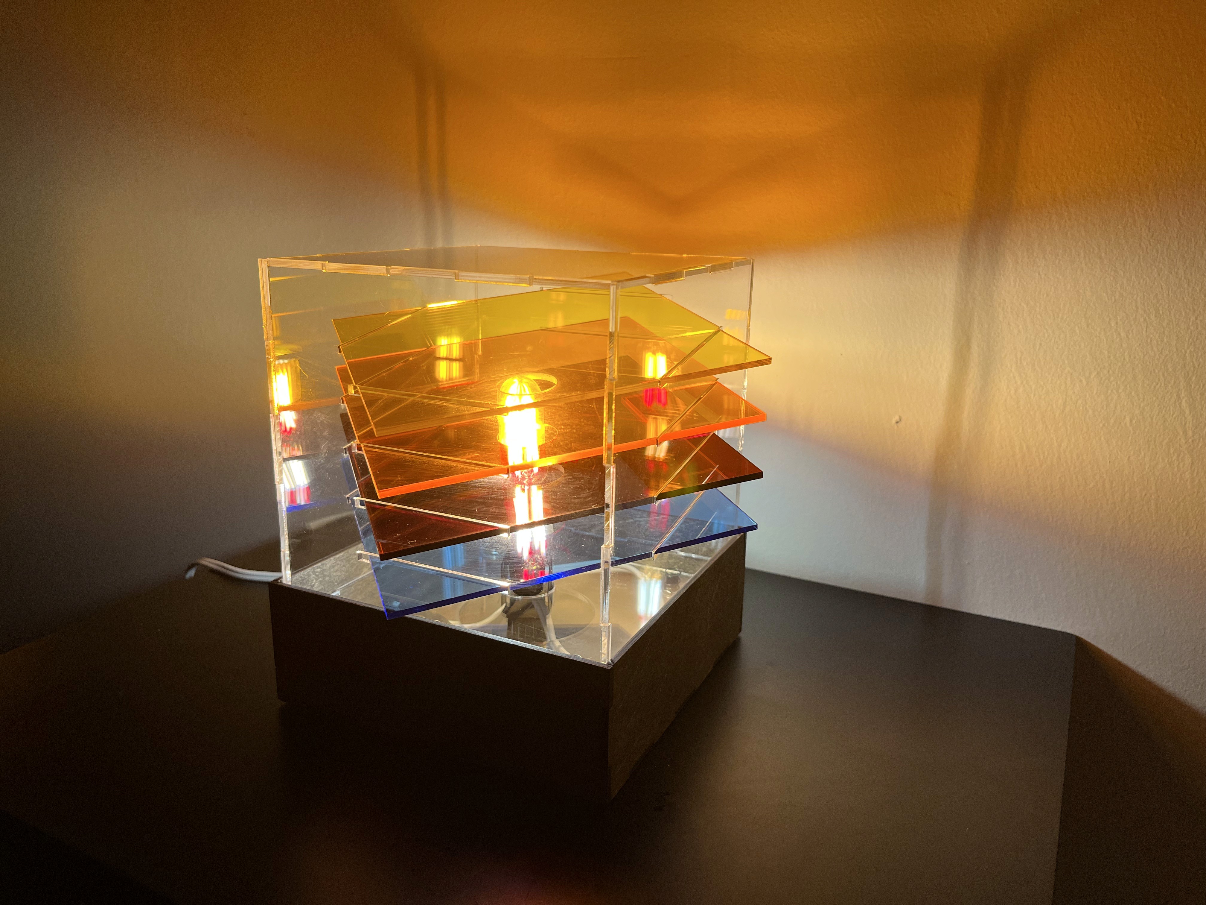 Inspired by the playful light interactions through the constraint of form of the work by artist Aaronel deRoy Gruber, I created a table side lamp using just square and rectangular shapes. I relied on the play of color and delightful interactions to create a warm and inviting atmosphere.