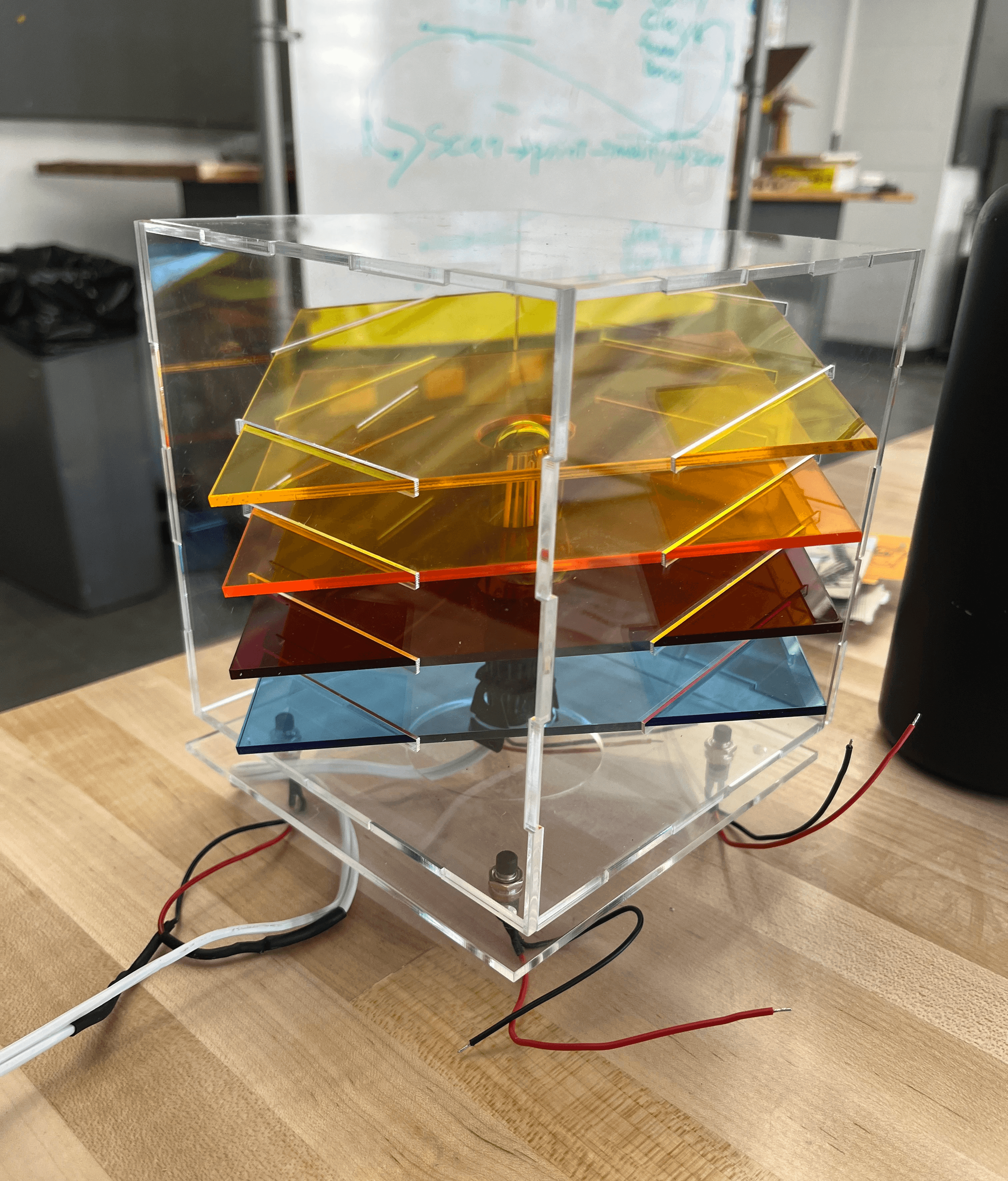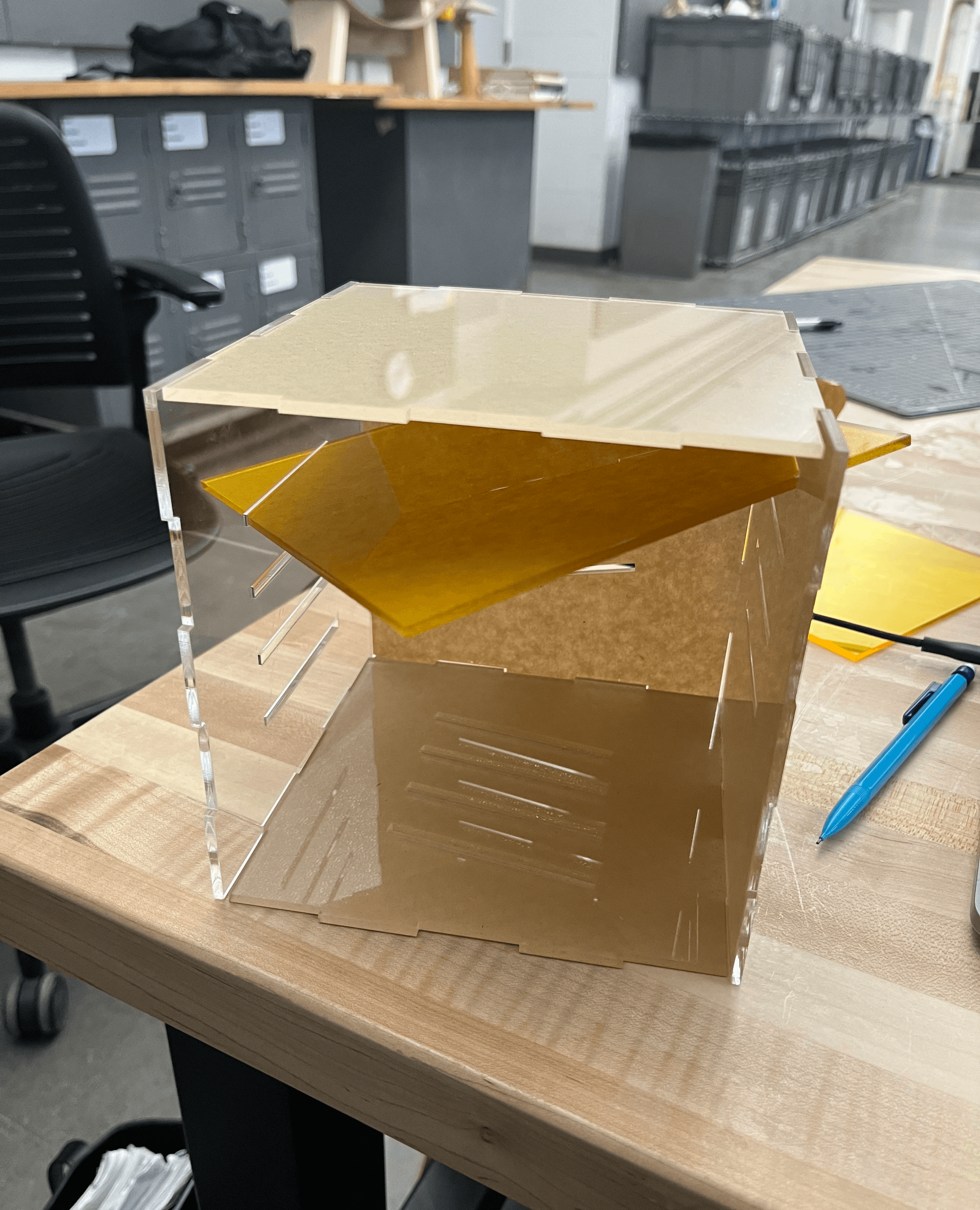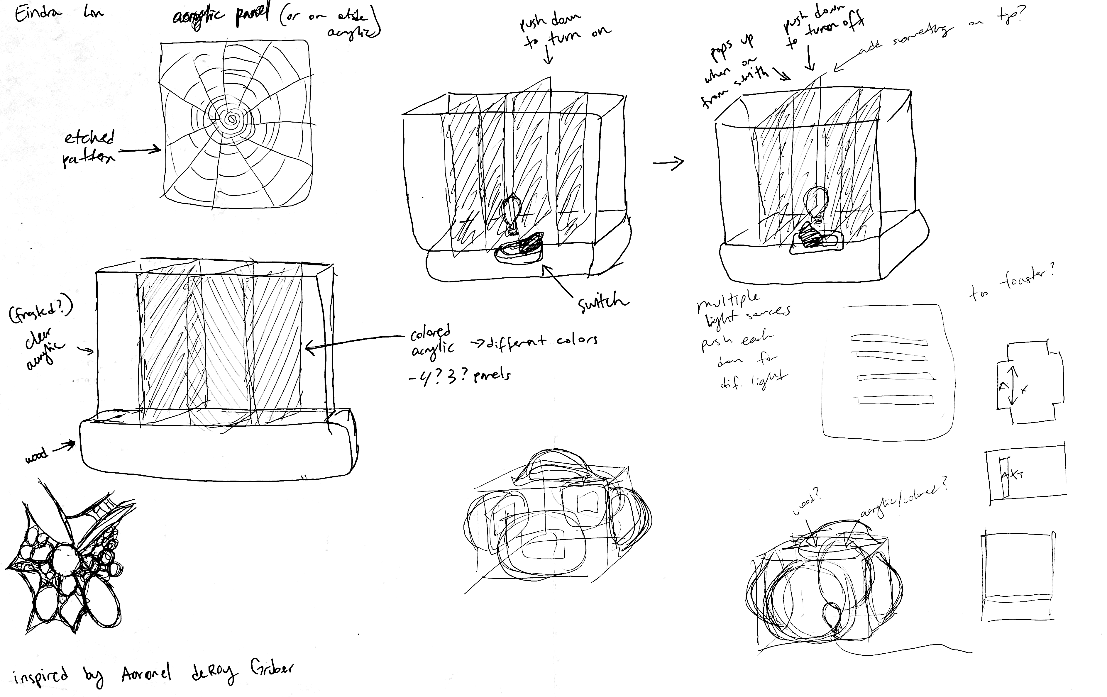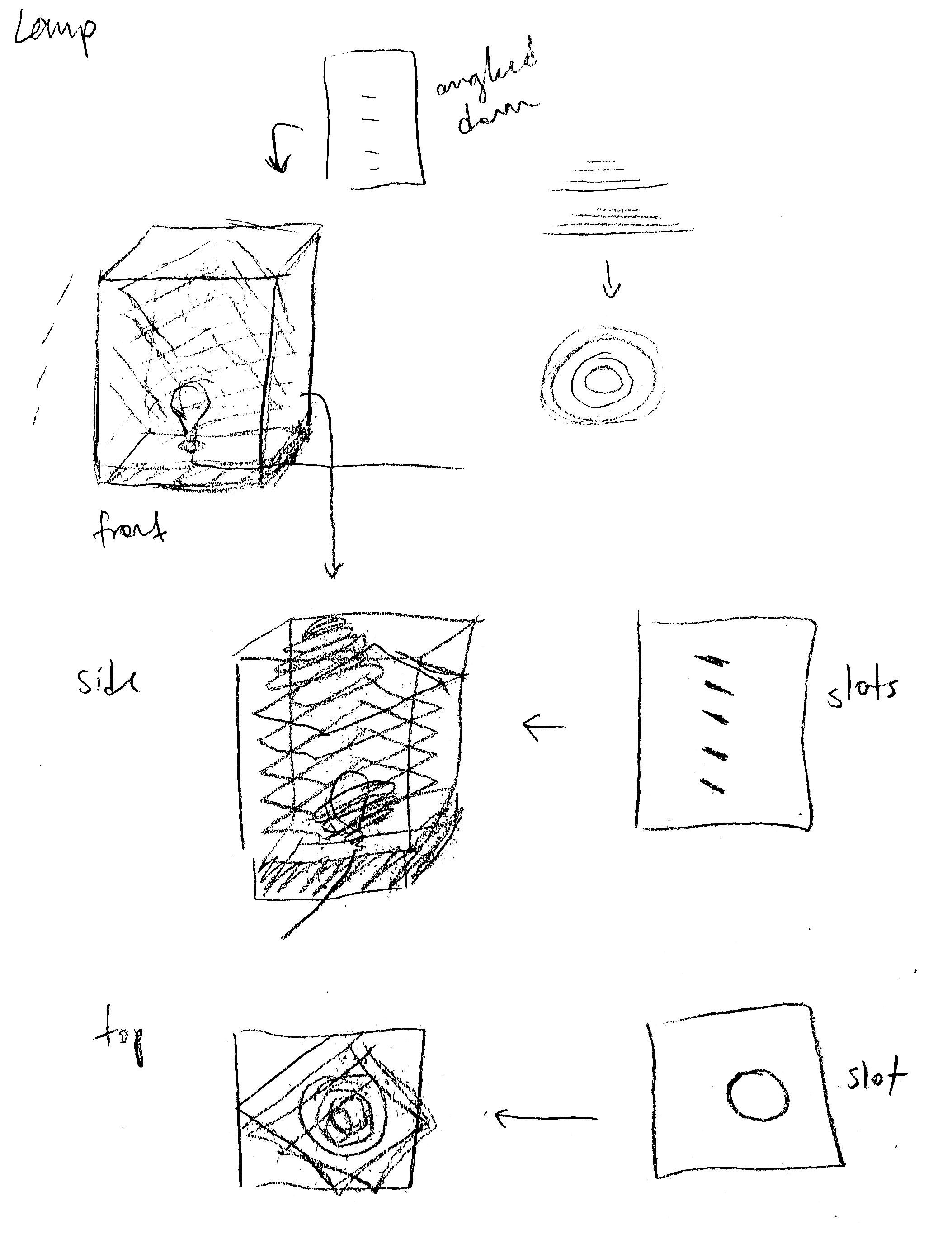 Inspired by the playful light interactions through the constraint of form of the work by artist Aaronel deRoy Gruber, I created a table side lamp using just square and rectangular shapes. I relied on the play of color and delightful interactions to create a warm and inviting atmosphere.